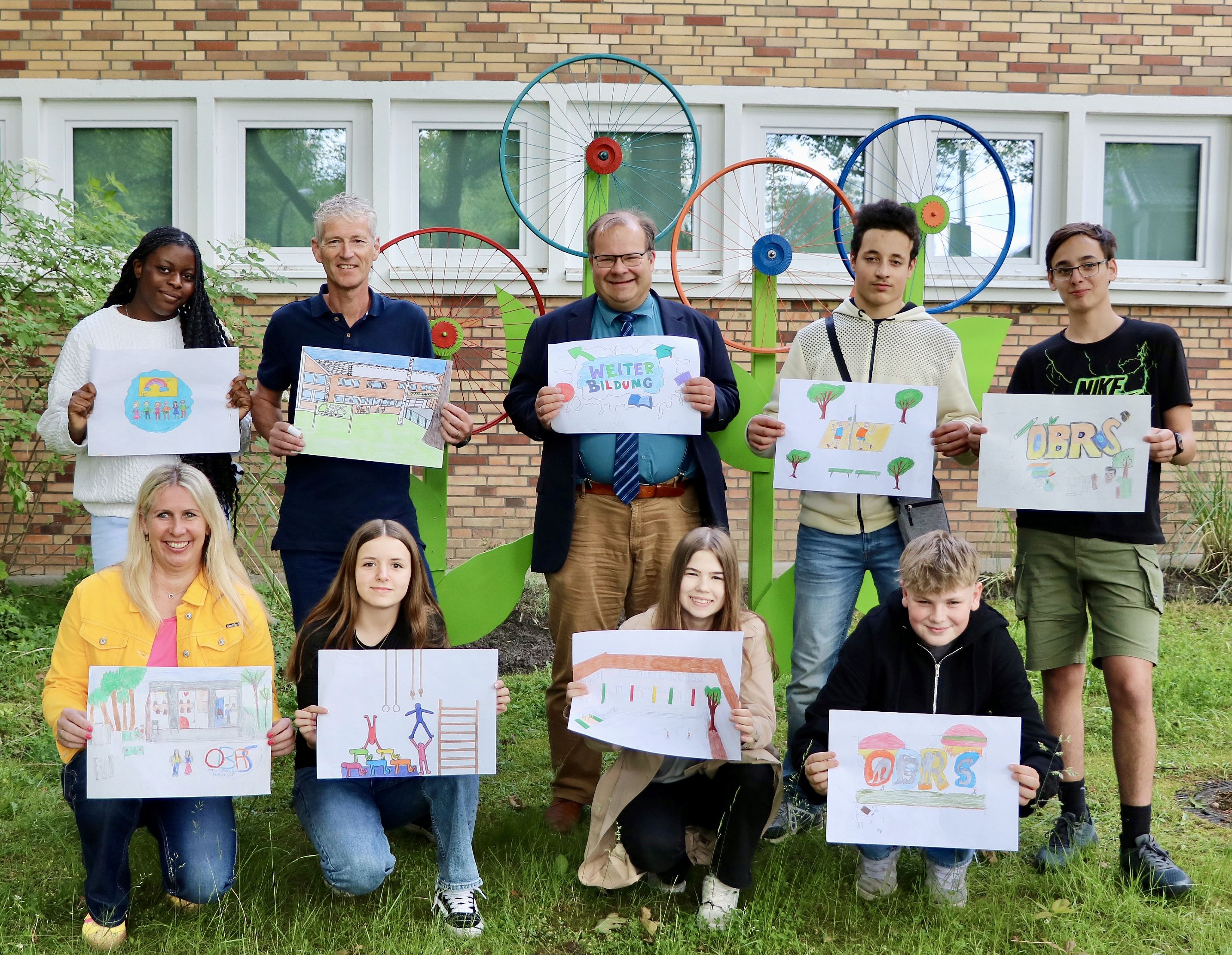 Die Ostseite der Bahnbrücke befasst sich mit den Themen „KSR und Otto-Burrmeister-Realschule (OBRS)“. Die OBRS wurde mit mehreren kleinen Details berücksichtig und von der Stadt innerhalb des Prozesses im Rahmen eines Projektes zur möglichen Gestaltung des Graffitis an der Bahnbrücke mit eingebunden. Innerhalb des Prozesses hatte sich Sozialdezernent Dr. Sebastian Sanders (obere Reihe Mitte) zusammen mit Schulleiter Lars Trzecinski (obere Reihe zweiter v.l.) ein Bild von den Entwürfen der Schüler*innen gemacht. Foto: Stadt RE