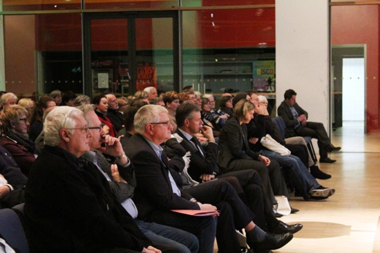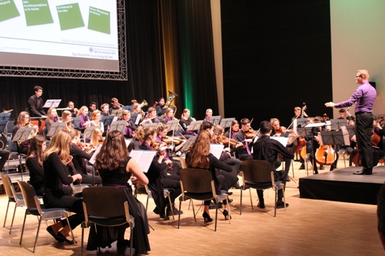 Natürlich gab es neben den Wortbeiträgen auch kulturelle Vorträge. Mit dem Stück „Opener“ heizte das Percussion-Ensamble der Musikschule den Besuchern ein, das Jugendsinfonieorchester spielte neben klassischen Stücken auch moderne Filmmusik-Klassiker wie „The Pink Panther“ und zuletzt sorgte Poetry Slammer Sulaiman Masomi mit seinem Text über den hohen Rat der Sprache für lachende Gesichter.