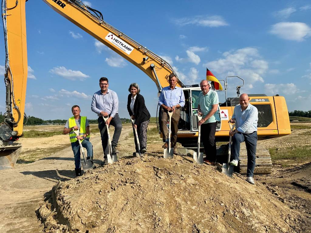 Pressefoto: Gemeinsam führten Olaf Bauerfrohn (Firma Heitkamp), Projektleiter Helge Wassermann, die Technische Beigeordnete Christina Kutschaty, Bürgermeister Christoph Tesche, SER-Aufsichtsratsvorsitzender Friedhelm Baumgarten und Timm Droop (Firma Ecosoil/v.l.) den symbolischen ersten Spatenstich zur Anlage des Heidesees auf dem ehemaligen Trabrennbahngelände durch. Foto: Stadt RE