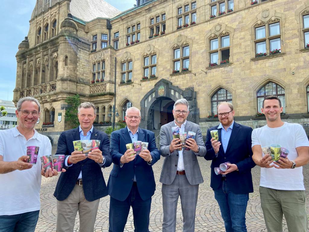 „Die Becher werden in einer Gesamtauflage von 20.000 hergestellt, in Deutschland produziert, sind Bisphenol A- und Melamin-frei und bestehen aus 100 Prozent Polypropylen, was komplett recyclingfähig ist“, zählte Hendrik Eßers, Leiter des städtischen Fachbereichs Wirtschaftsförderung, Standortmanagement, Stadtmarketing, weitere ökologische Aspekte auf.