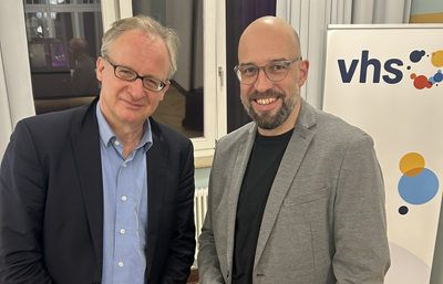 Foto (VHS Recklinghausen): Politikwissenschaftler Albrecht von Lucke (l.) und VHS-Leiter Dr. Ansgar Kortenjann.