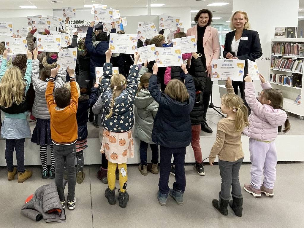 Pressefoto: Die Kinder der Rombergschule präsentieren der stellvertretenden Bürgermeisterin Marita Bergmaier (hinten l.) und der Leiterin der Stadtbibliothek, Sandra Hilse, stolz ihre Urkunden. Foto: Stadtbibliothek RE
