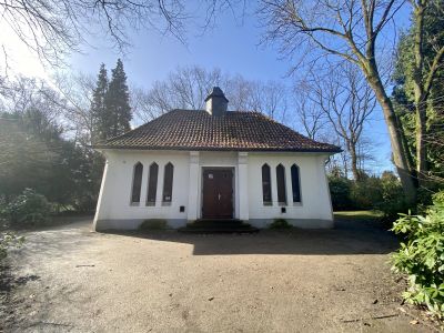 Historie: Das Gebäude, das ursprünglich 1904 als Aufbahrungshalle errichtet und 1914 zu einer Aussegnungshalle erweitert wurde, zeigt typische Merkmale des Historismus. Es handelt sich um einen Putzbau mit Eckpfeilern, einem zweiflügeligen Portal mit drei Stufen sowie der markanten Inschrift: „Christus ist mein Leben, Sterben mein Gewinn.“