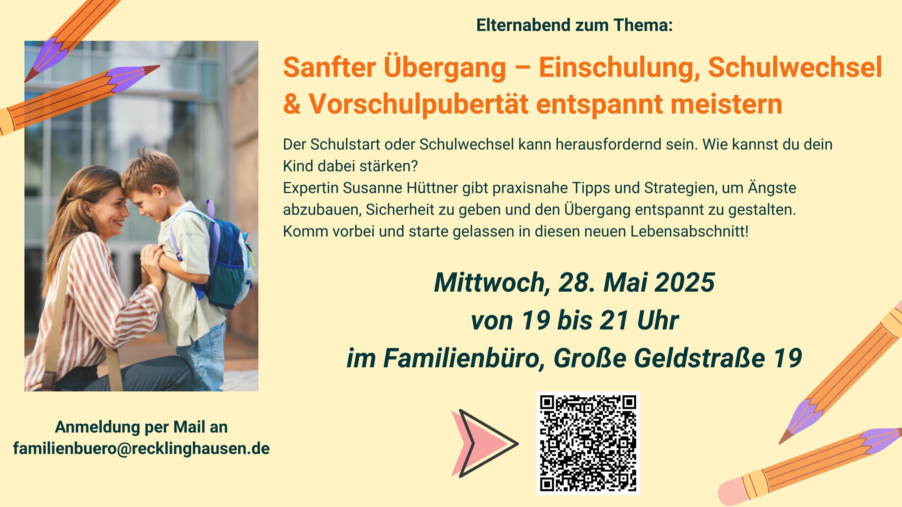 Um mögliche Konflikte zu vermeiden, bietet das Familienbüro, Große Geldstraße 19, am Mittwoch, 28. Mai, unter der Leitung von Susanne Hüttner, einen Elternabend für praxisnahe Tipps an. Die Veranstaltung „Sanfter Übergang – Einschulung, Schulwechsel & Vorschulpubertät entspannt meistern“ findet von 19 bis 21 Uhr statt.