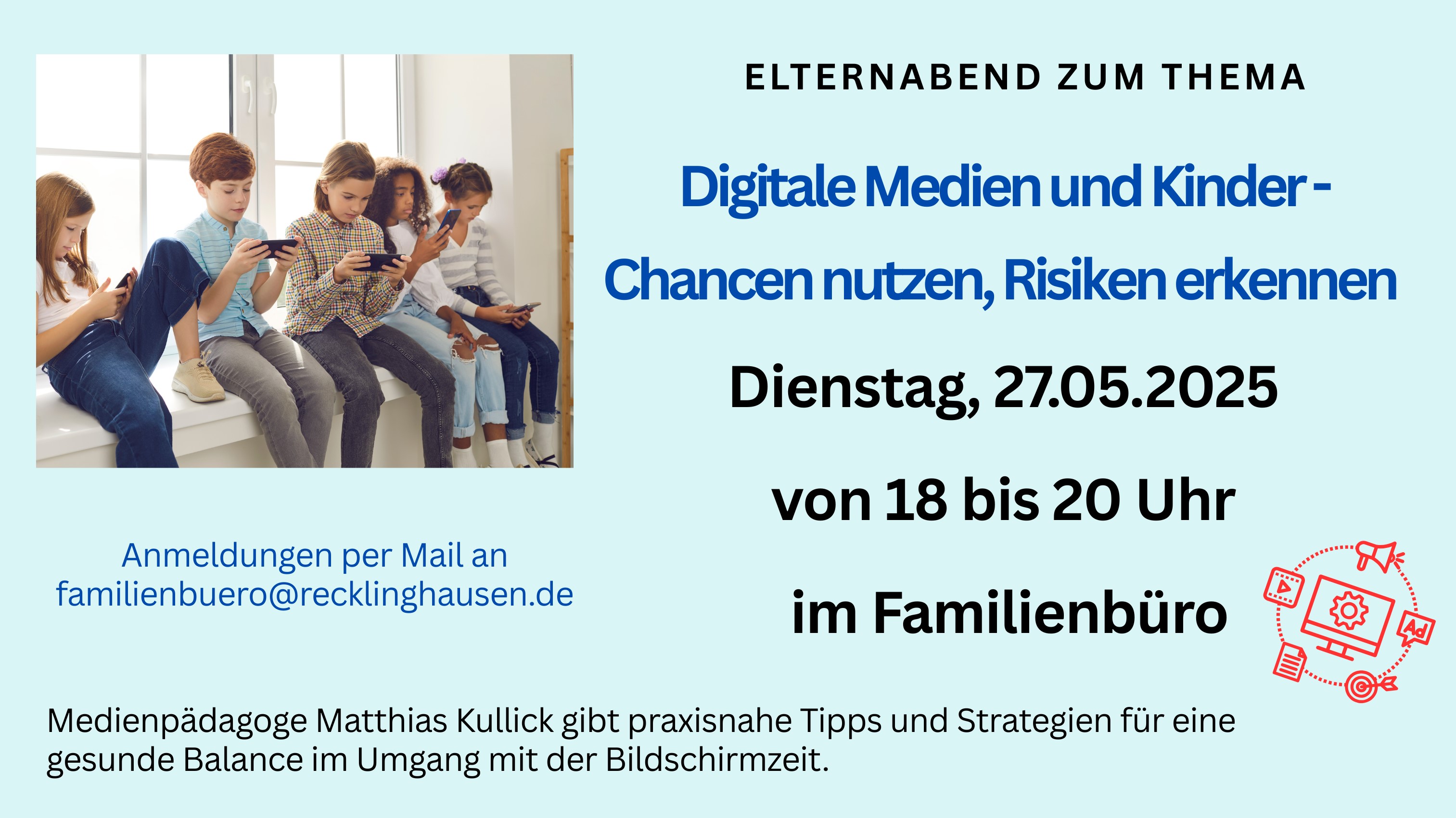Unter dem Titel „Digitale Medien und Kinder – Chancen nutzen, Risiken erkennen“ gibt der Medienpädagoge Matthias Kullick praxisnahe Tipps und präsentiert Strategien für eine gesunde Balance im Umgang mit der Bildschirmzeit.