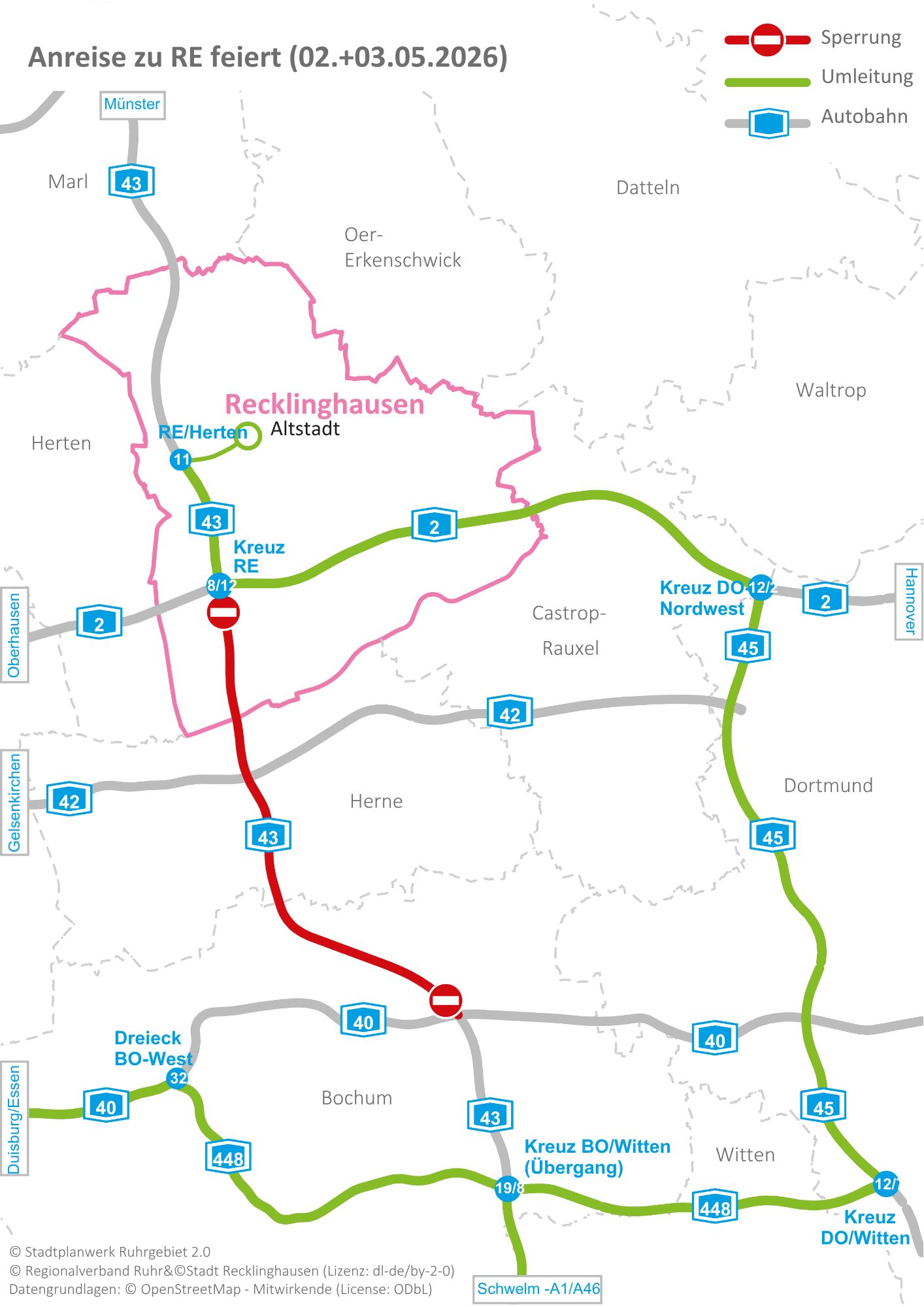 Letztlich gibt es noch einen wichtigen Hinweis zur Anreise: Besucher*innen werden gebeten, bei der Anreise die Verkehrssituation zu beachten. Von Donnerstag, 30. April 2026, um 21 Uhr bis Sonntag, 3. Mai 2026, um 5 Uhr ist die A43 in beiden Richtungen zwischen Kreuz Recklinghausen und Bochum-Riemke gesperrt. Grund ist nach Angaben der Autobahn GmbH der Abriss der letzten noch bestehenden Brücke im Zuge des Umbaus des Autobahnkreuzes Herne. Eine frühzeitige Planung der Anfahrt oder der Umstieg auf Bus und Bahn wird empfohlen.